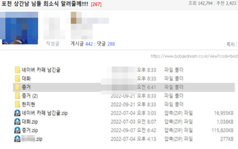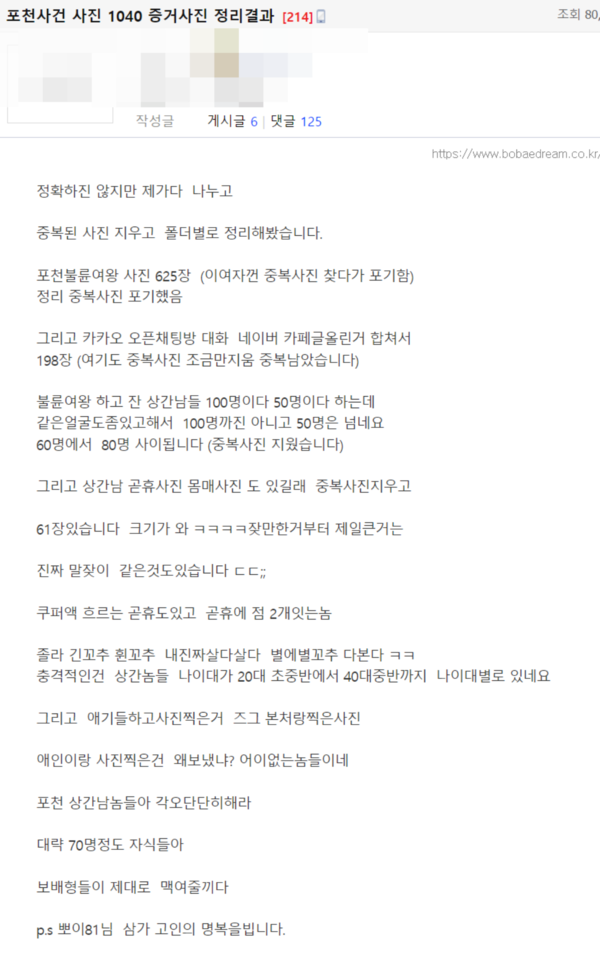 이 밖에도 다른 네티즌은 확보한 자료가 포천XX여왕 사진 625장, 그리고 카카오 오픈 채팅방 대화 내용, 네이버 카페글 올린 거 합쳐서 198장, XX여왕 하고 잔 상간남들 100명이다 50명이다 하는데 같은 얼굴도 좀 있고 해서 100명 까진 아니고 50명은 넘네요. 60명에서 80명 사이, 상간남 XX 사진 61장이 있다고 밝혔죠.