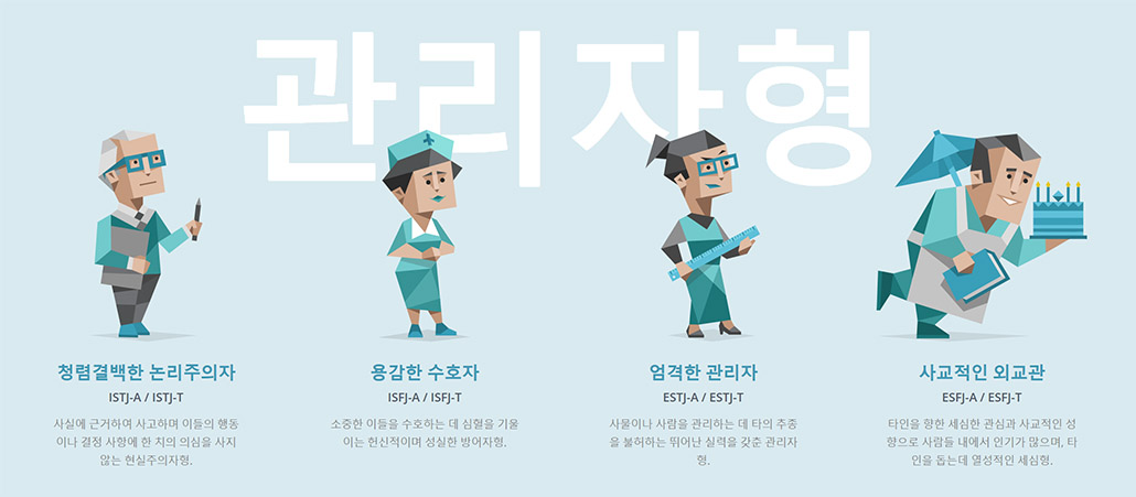 ③ 엄격한 관리자 : 사물이나 사물을 관리하는데 타의 추종을 불허하는 뛰어난 실력을 갖춘 관리자형 (ESTJ-A / ESTJ-T)