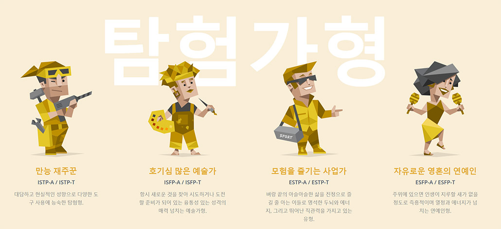 ① 만능 재주꾼 : 대담하고 현실적인 성향으로 다양한 도구 사용에 능숙한 탐험형 (ISTP-A / ISTP-T)
