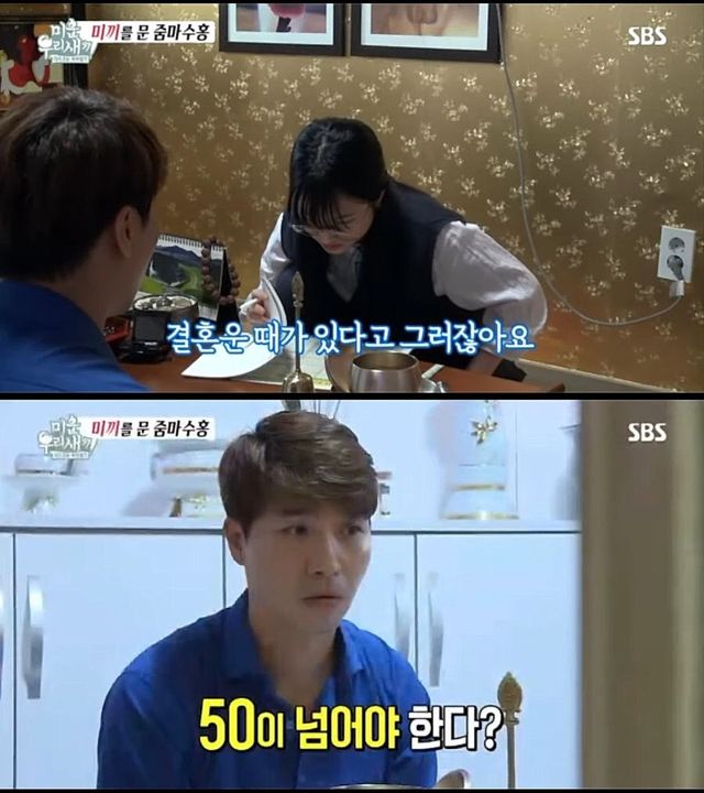 당시 역술가는 박수홍의 사주를 본 뒤 "결혼운 때가 있다고 하지 않나. 결혼은 50세가 되어야 할 거 같다"라고 말했죠. 실제로 박수홍은 만 50세 나이인 지난해 2011년 결혼을 하였습니다.