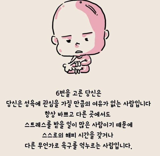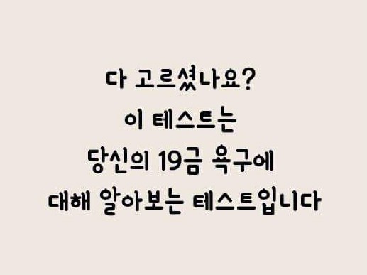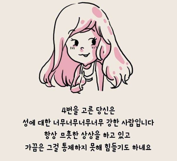 많은 사람들이 심심할 때 한 번쯤은 하는 게 바로 각종 심리테스트입니다. 심리테스트는 무료한 시간을 보내기에 정말 좋은 놀이라고 할 수 있죠. 그런데 다양한 심리테스트 중에서 딱 하나 찾지 못한 게 바로 19금 관련된 심리테스트인데요. 그래서 오늘은 숨겨진 나의 19금 욕구는 어느 정도인지 알아볼 수 있는 테스트를 준비해보았습니다.