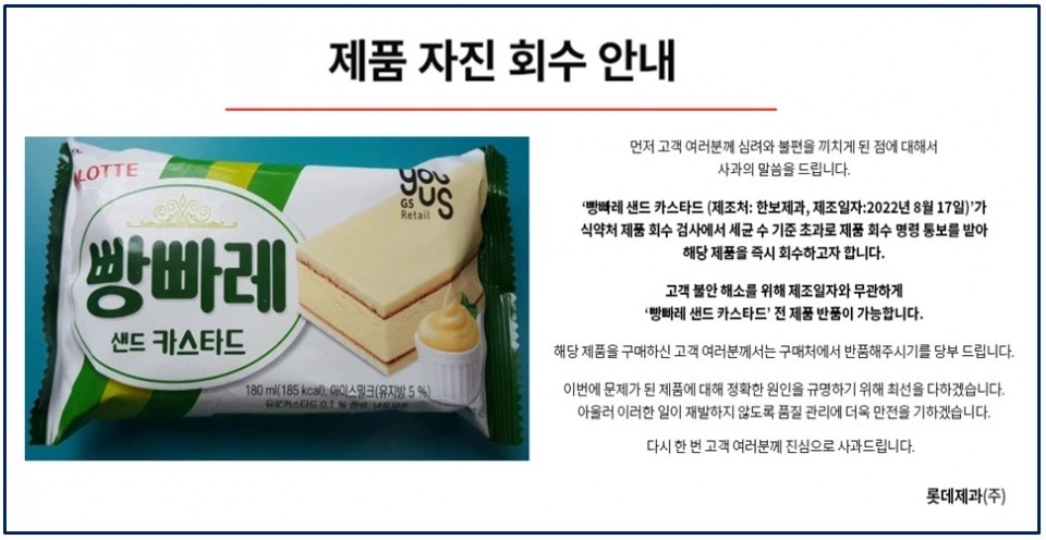 이에 롯데제과에서는 기준치를 초과한 '빵빠레 샌드 카스타드' 제품을 전량 회수한 것으로 전해졌죠. 롯데제과는 자사 홈페이지를 통해 '제품 자진 회수 안내'를 통해 지난 8월 17일 제조된 '빵빠레 샌드 카스타드' 제품 전체를 전량 회수했다고 밝혔습니다.