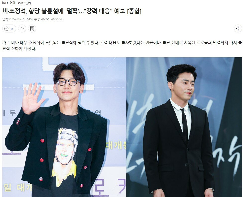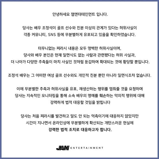 이어 "조정석은 그 어떠한 여성 골프 선수와도 개인적 친분뿐만 아니라 일면식조차 없다"며 "지라시를 발견하고 말도 안 되는 억측이기에 대응하지 않았지만 시간이 지나면서 온라인상에 무분별하게 확산하는 개탄스러운 현실에 강력한 법적 조치로 대응할 것"이라고 밝혔습니다.