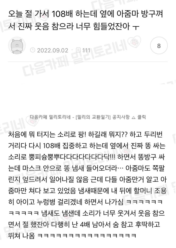 절에서 108배 하는데 옆에 아주머니가 방귀를..(+반전)
