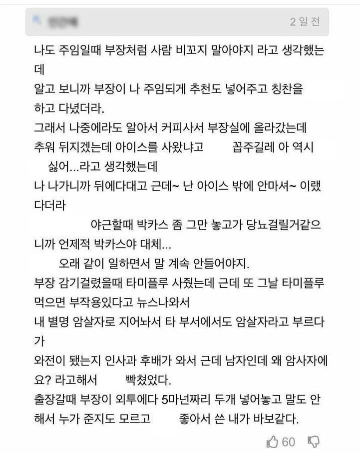 응? 이건 잘 챙겨주는건가? 아니면 진짜 썸을 타는건가 출장갈때 어느 부장이 부하 직원에게 출장가서 쓰라고 5만원을 준다고....이건 둘이 분명히 무슨 관계인게 틀림없다. 혹시 쓴이 모르게 회사에서 마니또를 한건가? 모르게 잘 챙겨주기 이런 미션 말이다.