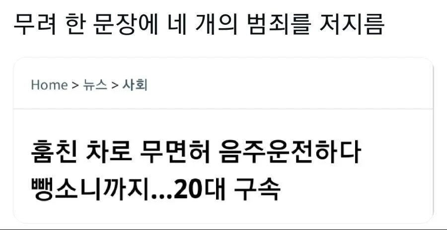 이 짧은 한 문장에 벌써 훔친차는 차량 도난죄 무면허는 무면허 운전이고 음주운전은 바로 음주운전 거리게 뺑소니까지 그런데 여기다 저렇게 운전을 했으면 신호 위반에 속도위반까지 했을거고 만약 중앙선 침법까지 했으면 진짜 한번에 제대로 사고 친거 맞네