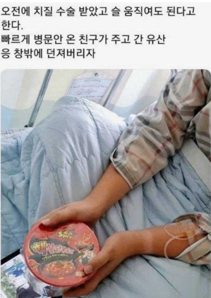 정말 친한 친구 사이니깐 할 수 있는 장난들이 있습니다. 오늘 사연 역시 그런 친구니깐 가능한 장난이라고 할 수 있는데요. 이제 막 치질 수술을 끝낸 친구에게 빨리 쾌유를 하라는 의미로 불닭볶음면을 선물한 친구들 아마도 저걸 먹으면 바로 재수술을 해야 할거 같지만 그래도 친구니깐 저런 장난을 할 수 있는거겟죠?