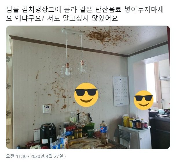 김치냉장고에 일단 탄산음료만 보관했다고 해서 저렇게 폭발하지는 않았을 거 같은데 냉장고에 탄산을 얼리면 팽창을 해서 병 같은 경우에는 깨질 수 있다는 건 예전에 틀었지만 저건 폭발 수준이기 때문에 그냥 저렇게 되지 않았을 거다 분명 우리가 모르는 뭔가가 있다.