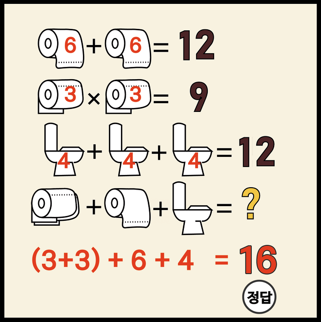 정답은 16 입니다. 90% 이상은 한번은 틀린다고 하는데요. 과연 여러분들이 계산한 정답과 얼마나 잘 맞으시는지 궁금합니다. 과연 여러분들은 10%의 천재일지 90%의 일반인일까요?