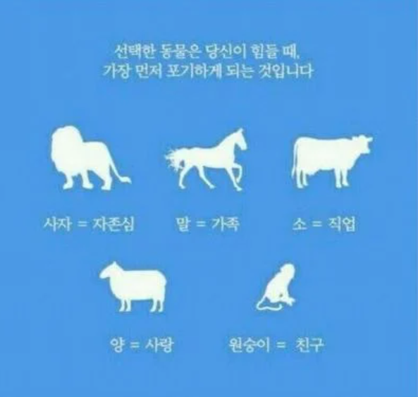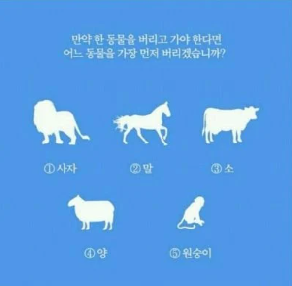 자.!! 여러분들이라면 사막을 건널 때 한 마리의 동물을 버려야 한다면 과연 어느 동물을 버리겠습니까? 신중하게 생각하기보다는 지금 당장 머릿속에 떠오르는 걸 선택하시면 될 겁니다. 결과는 아래에...