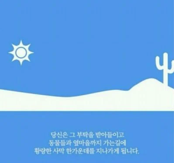 당신은 그 부탁을 받아들이고 동물들과 옆마을까지 가는 길에 황량한 사막 한가운데를 지나가게 됩니다.