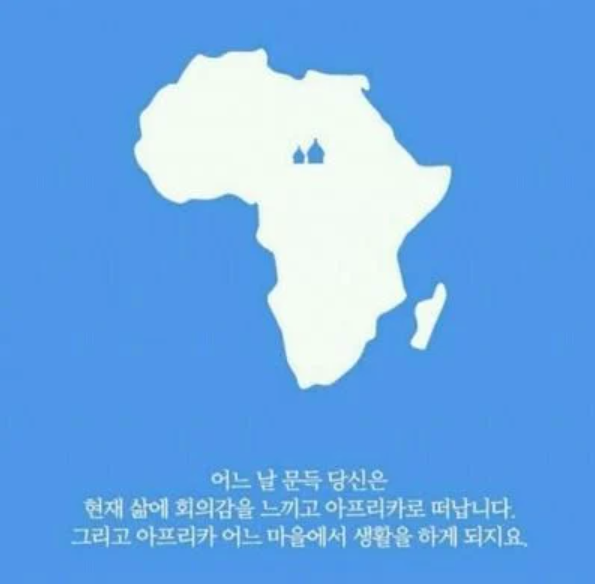 어느 날 문득 당신은 현재 삶에 회의감을 느끼고 아프리카로 떠납니다. 그리고 아프리카 어느 마을에서 생활을 하게 되지요.