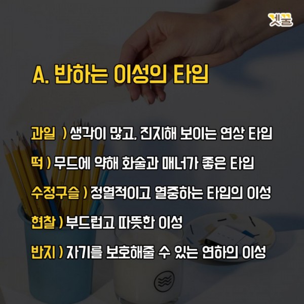이 테스트는 자기가 반하는 이성 타입을 알려주는 심리테스트였는데요. 어떻게 여러분들이 반하는 이상형의 모습과 일치하시나요?