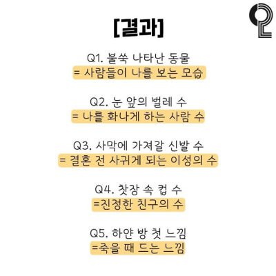 5가지의 질문에 대답을 잘 생각해 두셨나요? 그렇다면 과연 각 질문은 어떤 의미가 있는걸까요? 아래를 보시면 그 결과가 있으니 본인의 답과 잘 한번 비교를 해보세요.