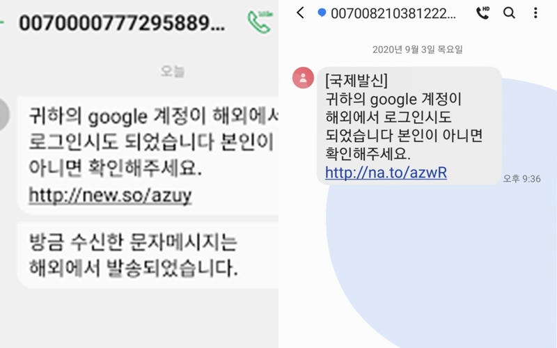 이제는 구글 계정 하나쯤 없는 분들이 없을 정도로 구글 계정은 유튜브는 물론이고 안드로이드 스마트폰을 셋팅할때 기본적으로 필요한 계정이라고 할 수 있죠. 그렇다 보니 이러한 계정을 노리는 스미싱 문자들도 많아지고 있습니다. 그중에서 특히 "귀하의 구글 계정이 해외에서 로그인되었다"라는 문자인데요.