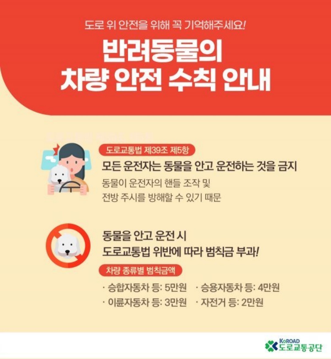 우리나라 도로교통법 제39조 5항에 의하면 '모든 차의 운전자는 영유아나 동물을 안고 운전 장치를 조작하거나 안전에 지장을 줄 우려가 있는 상태로 운전하여서는 안된다'라고 명시되어 있습니다. 만약 반려동물을 안고 운전을 한다면 도로교통법 제1호에 따라 20만 원 이하의 벌금, 구류 또는 과태료 처분을 받게 되죠. 차량 종류에 따라 금액은 승합자동차 5만 원, 승용자동차 4만 원, 이륜자동차 3만 원, 자전거 3만 원에 차종에 상관없이 벌점 10점이 부과되죠.