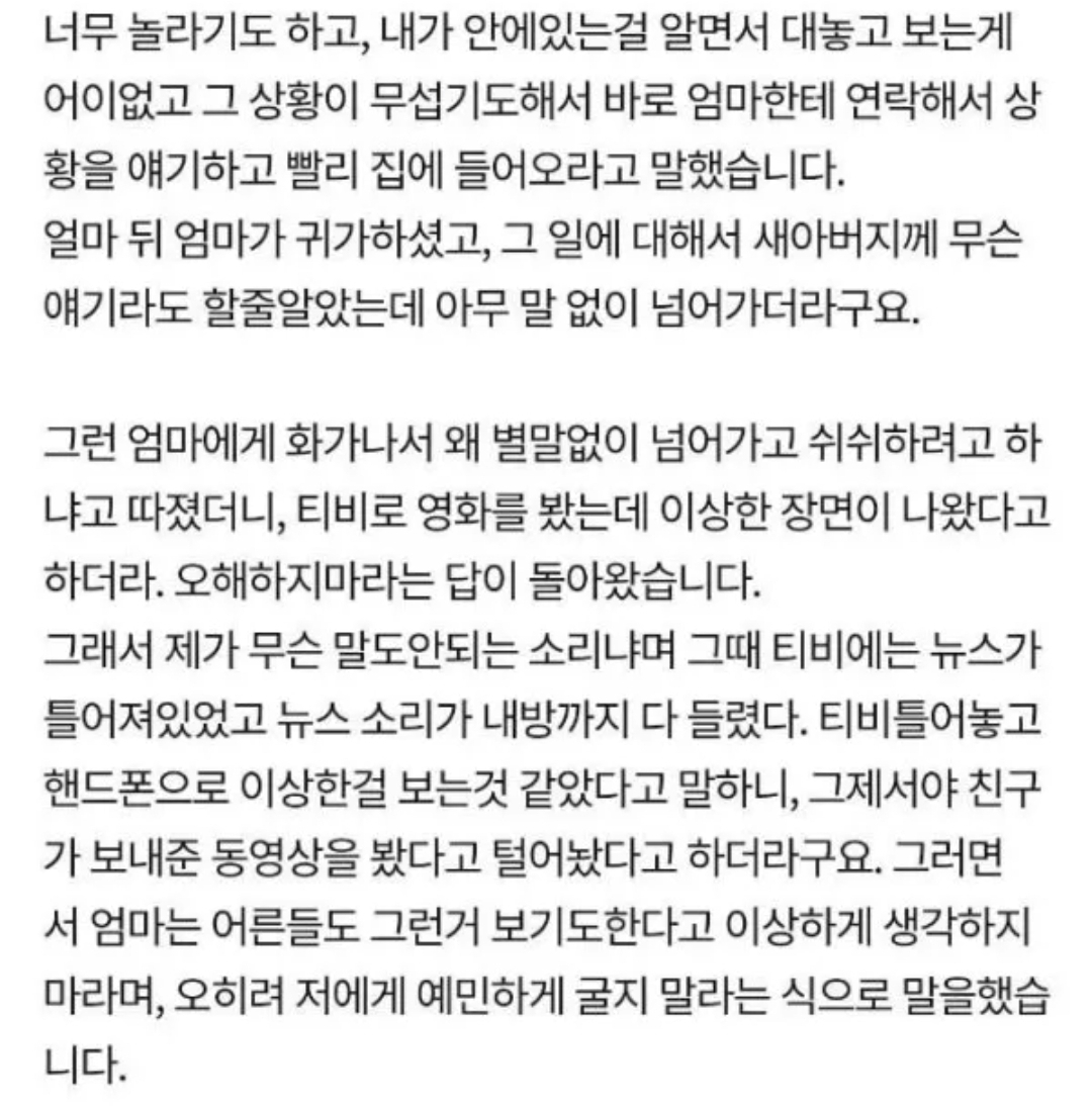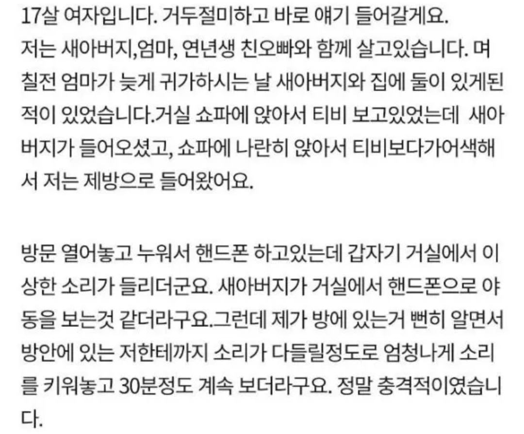 이어 “얼마 전 엄마가 늦게 귀가하시는 날 새아빠와 둘이 거실 소파에서 티브이를 보다가 어색해서 내 방으로 들어왔다”라고 말했다.