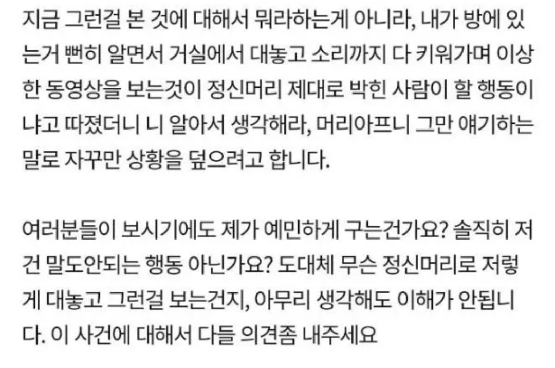 A 씨는 “내가 방에 있는 거 뻔히 알면서 방안에 있는 저한테까지 소리가 다 들릴 정도로 엄청나게 소리를 키워놓고 30분 정도 계속 봤다. 정말 충격적이었다”라고 하소연했다.