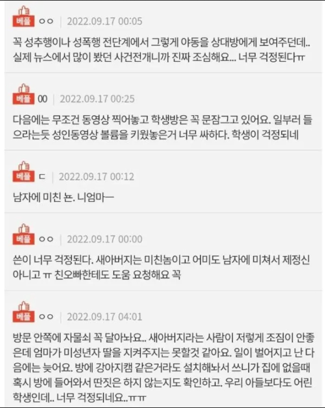다른 네티즌들도 “남자에 미친 엄마”, “글쓴이 너무 걱정된다”, “방문 안쪽에 자물쇠 꼭 달아놔요”, ‘조짐이 안 좋다”, “몰카 조심하세요”, “방 안에 CCTV 하나 몰래 놔두세요”, “친오빠한테 도움 요청하세요” 등 우려가 쏟아졌다.