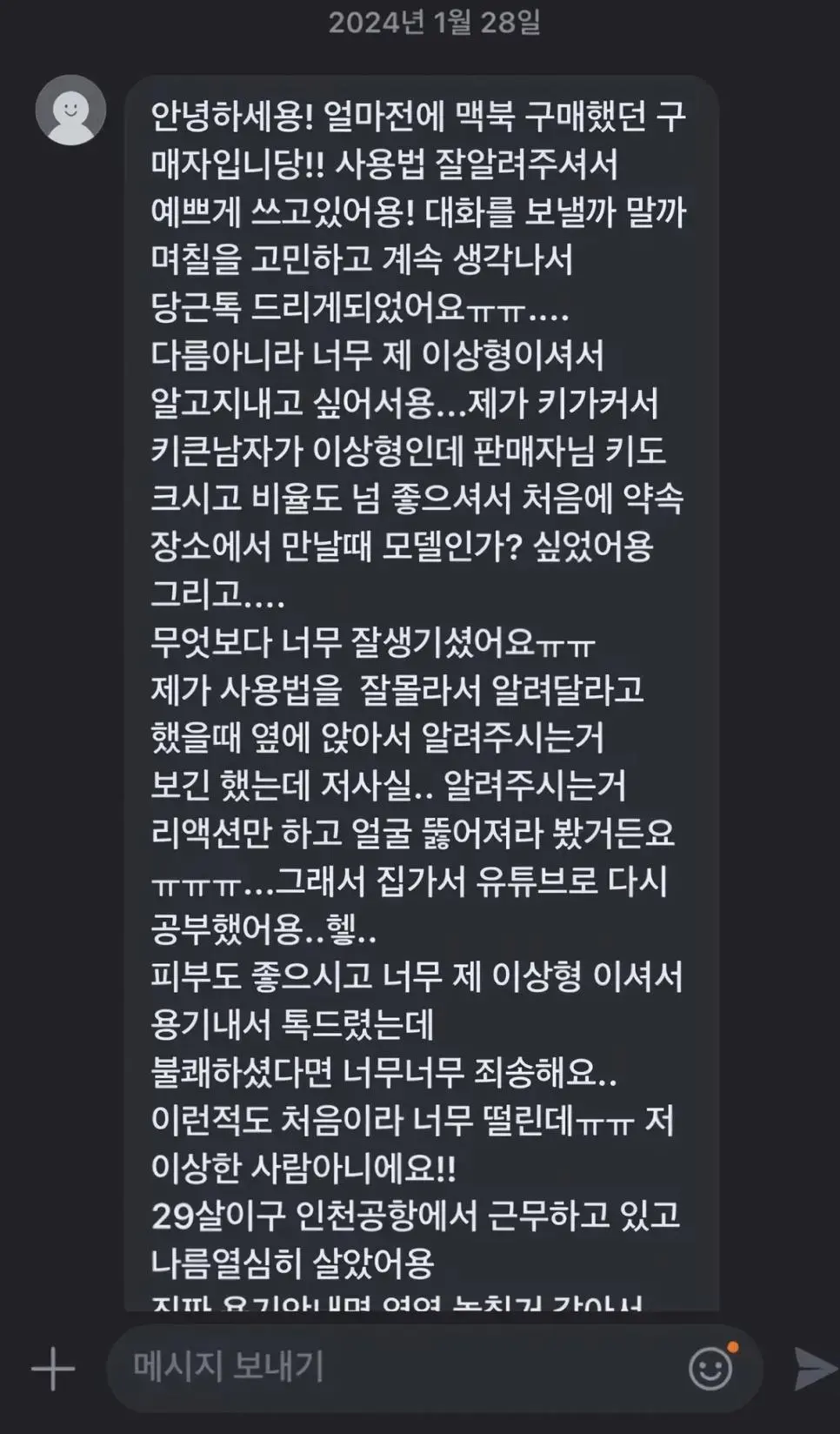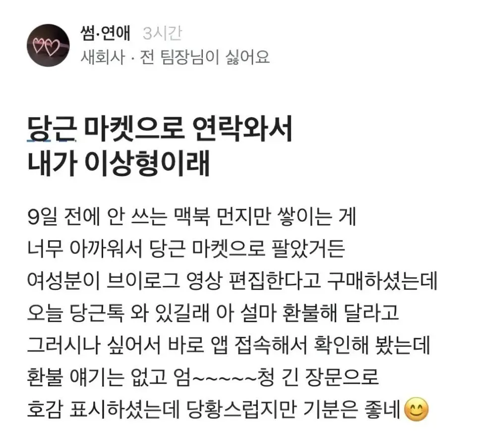 당근마켓에서 맥북팔았는데 구매자가 연락옴 예전에 유퀴즈에서 당근으로 밥솥 거래했다가 결혼까지 한 커플이 있었는데..사실 중고거래 하다보면 가끔 이상형의 이상이 나오면 설레일때 있지 않냐? 나도 가끔 있어 근데....말을 걸기 무서워 ㅠㅠ 공유하기 게시글 관리 벼락유머 저작자표시 (새창열림) 뜨고있는뿜