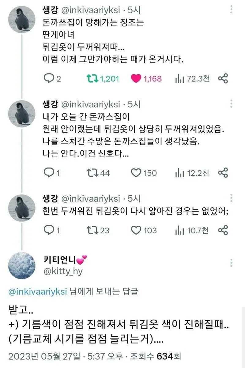 망해가는 돈까스집 특징 예전에 돈가스 집 알바할때 경험을 바탕으로 이야기를 한다면 가급적 돈가스는 오전이나 점심때 먹어라 저녁때쯤 되면 기름이 눌러붙어서 아무리 맛있는 집이라도 기름 쩐네 난다. 공유하기 게시글 관리 벼락유머 저작자표시 (새창열림) 뜨고있는뿜