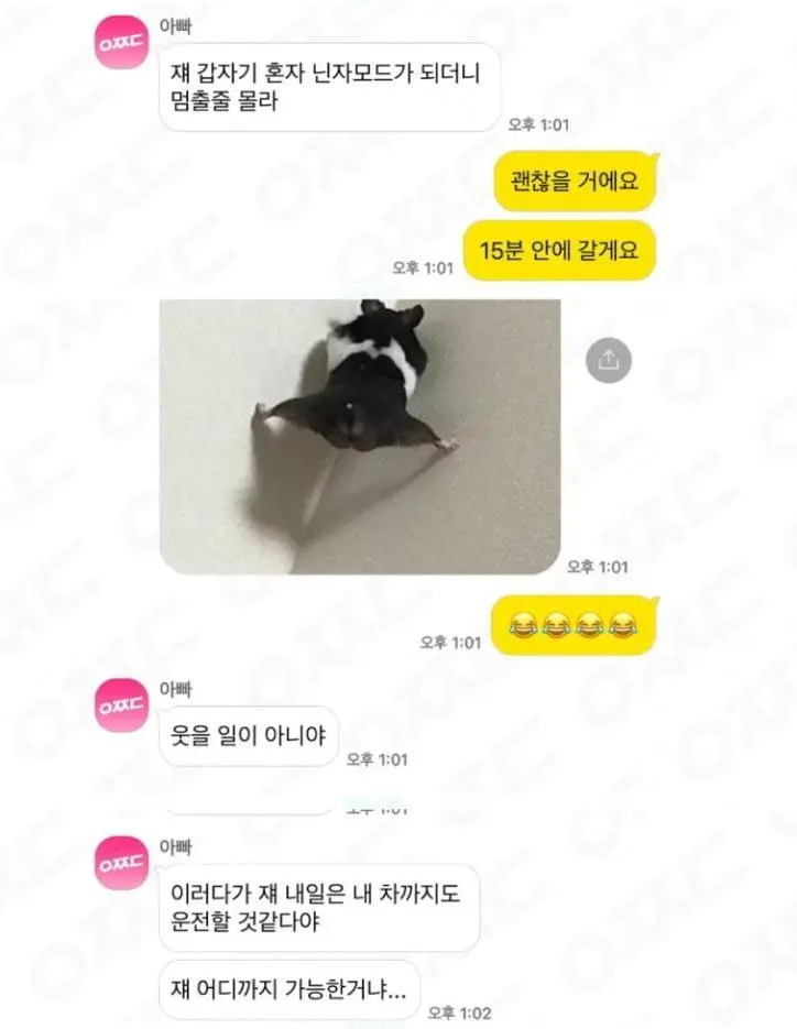 당황한 아버지와 탐스러운 햄스터 아니 왜 저러고 있는건데? ㅋㅋㅋ 보통 햄스터는 그 어항 같은 우리 안에서만 키우는거 아니였어? 순간 진짜 놀라서 잡으면 어떻게 할려고 ㅋㅋㅋㅋ 근데 다리 쫘악 벌린거 존귀다.ㅋ 공유하기 게시글 관리 벼락유머 저작자표시 (새창열림) 뜨고있는뿜
