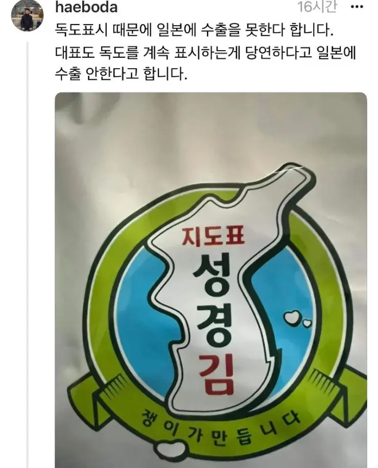 일본에서는 살 수 없는 맛있는 김.jpg 처음에는 이걸 왜 일본에 안 팔지 라고 생각을 했는데..지도를 보고 딱 이해를 함..ㅋㅋ 지도에 울릉도와 독도를 박아 버렸네 ㅋㅋㅋ 이러면 일본에서는 안 팔겠지 ㅋㅋ 공유하기 게시글 관리 벼락유머 저작자표시 (새창열림) 뜨고있는뿜