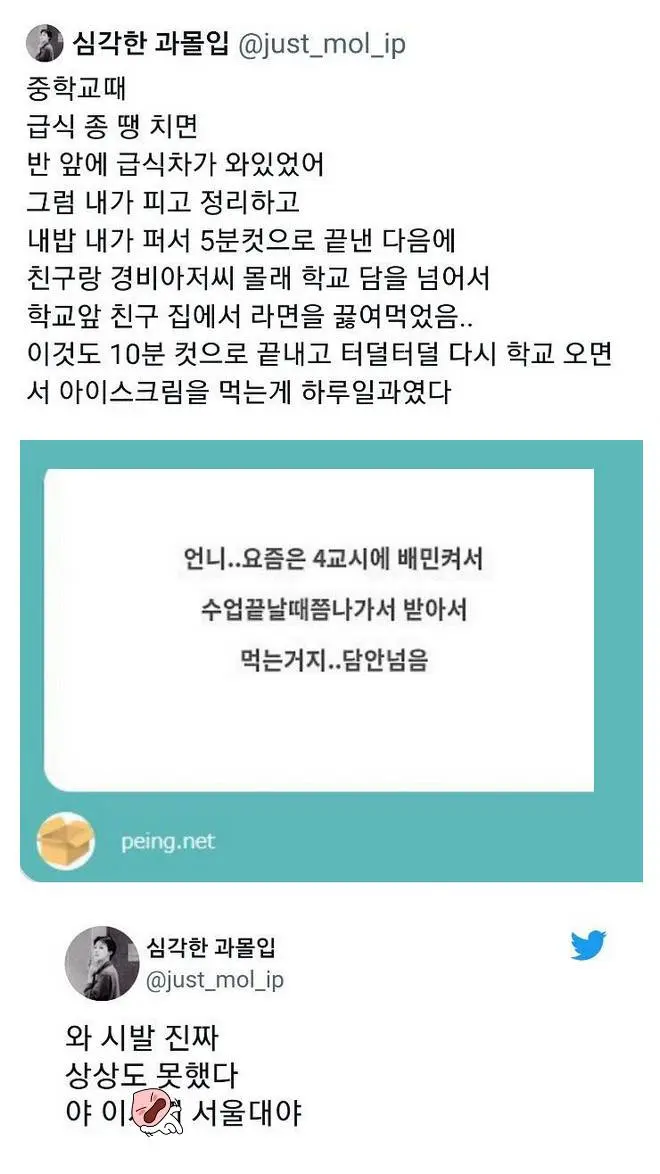 요즘 세대들은 급식 맛 없으면..jpg 와...요즘은 그냥 배민으로 시켜 먹는구나 ㅋㅋㅋ 진짜 시대가 엄청 달라졌네 ㅋㅋㅋ 반 애들 한번에 다 모아서 배민으로 주문하면 배달비도 개꿀이고 공유하기 게시글 관리 벼락유머 저작자표시 (새창열림) 뜨고있는뿜