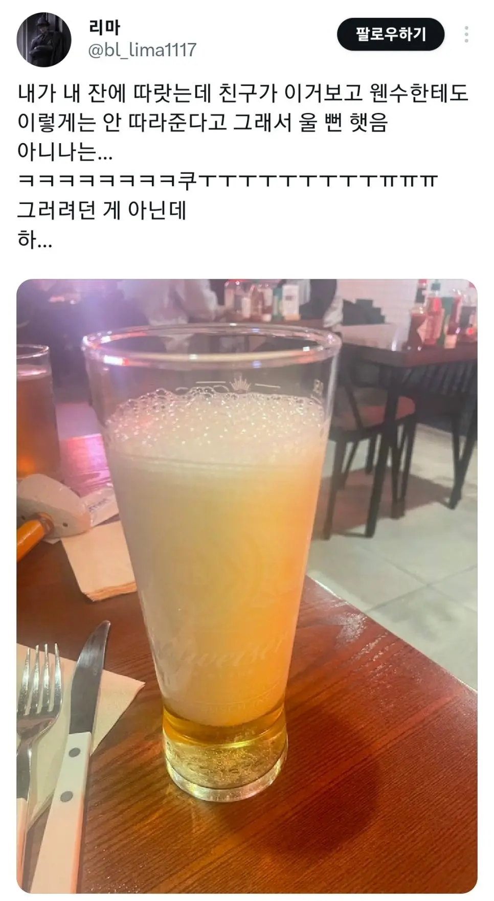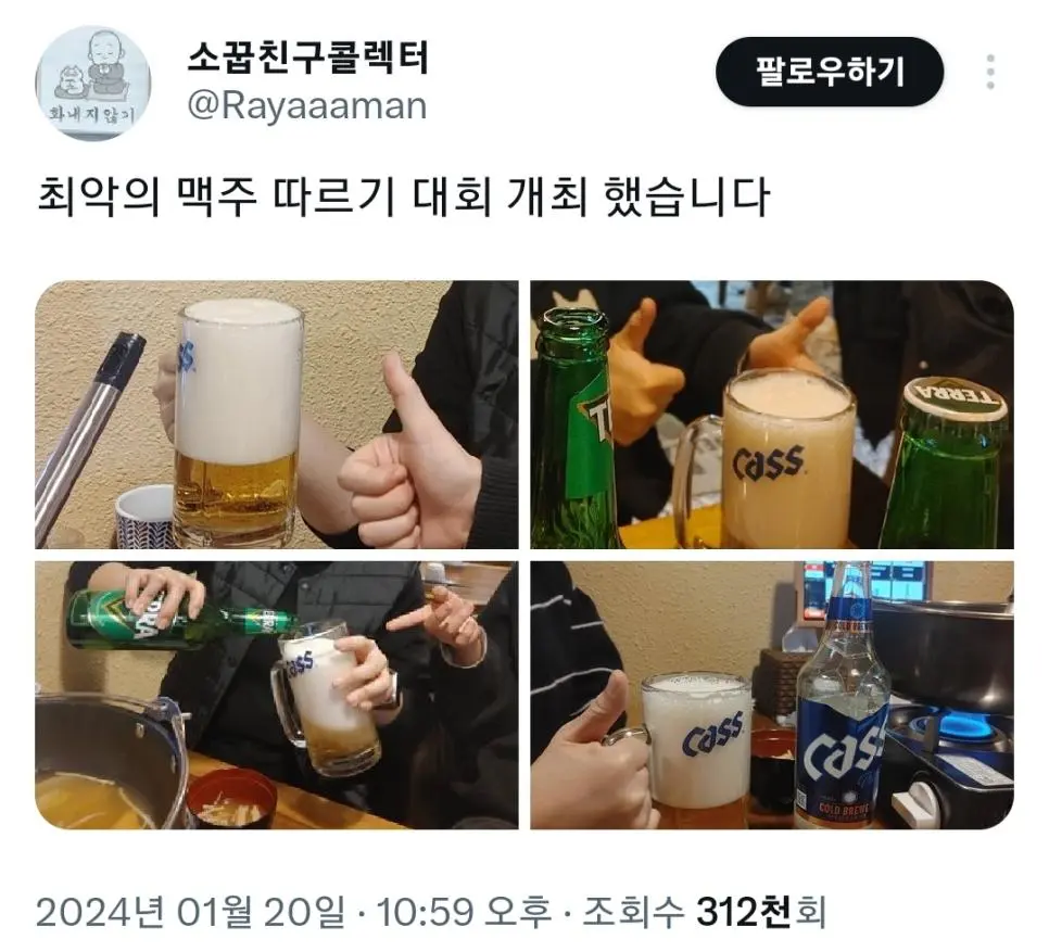 최악의 맥주 따르기 대회 개최.jpg 맥주를 따르라고 했더니 거품을 따르고 있네 ㅋㅋㅋ 진짜 거품 하나도 없이 맥주 따르는 사람들 진짜 신기하더라..하지만 어느 정도 적당히 맥주가 있어야 그게 또 맛있다 공유하기 게시글 관리 벼락유머 저작자표시 (새창열림) 뜨고있는뿜