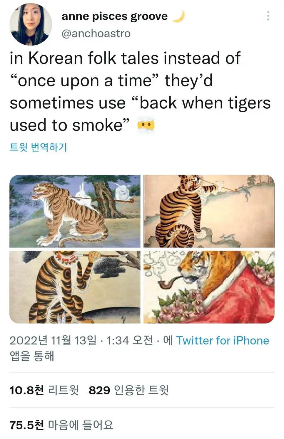 해외에서 힙하다고 생각하는 한국 속담.jpg "back when tigers used to smoke""호랑이 담배피던 시절" 공유하기 게시글 관리 벼락유머 저작자표시 (새창열림) 뜨고있는뿜