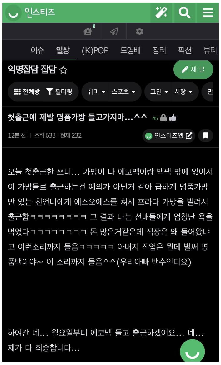 첫출근에 명품가방 들고 감 첫출근에 멀 들고 가던 멀 입고 가던 그게 무슨 상관인가? 일만 잘하면 되지 물론 보는 사람에게는 좀 그럴수 있지만 센스만 있으면 된다 공유하기 게시글 관리 벼락유머 저작자표시 (새창열림) 뜨고있는뿜