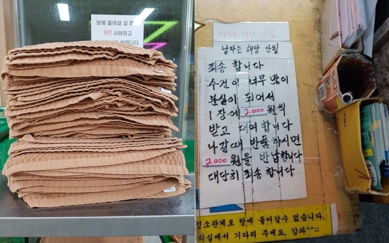 목욕탕을 이용할때 여성분들이 가장 불만인 부분이 바로 '수건'입니다. 지역마다 조금씩 차이가 있기는 하겠지만 여성의 경우에는 기본적으로 수건 2장 만을 제공합니다. 남성의 경우에는 보통 머리부터 발끝까지 수건 한 장으로 사용하는 경우들이 많습니다. 하지만 여성분들의 경우 부위마다 수건을 달리해 수건의 사용량이 많다고 하는데요. 또한 분실률 역시 남탕에 비해 여탕이 더 높다고 합니다. 이에 실제로 남탕과 여탕 각각 100장의 수건을 두고 실험을 한 결과 여탕에서는 일주일 만에 약 70장의 수건이 사라졌지만 오히려 남탕에서는 20장이 넘게 수건이 수거되었다고 합니다.