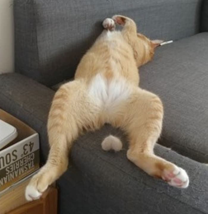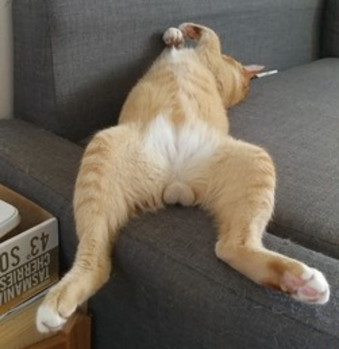 최근 온라인 커뮤니티를 중심으로 화제가 되고 있는 사진이 있습니다. 편안하게 소파에서 마치 사람처럼 잠을 자고 있는 고양이의 모습이죠. 그런데 사진을 자세히 보면 고양이의 다리 사이에 무엇인가 떨어져 나간 걸 확인할 수 있는데요. 과연 무엇이 떨어져 나갔을까요?