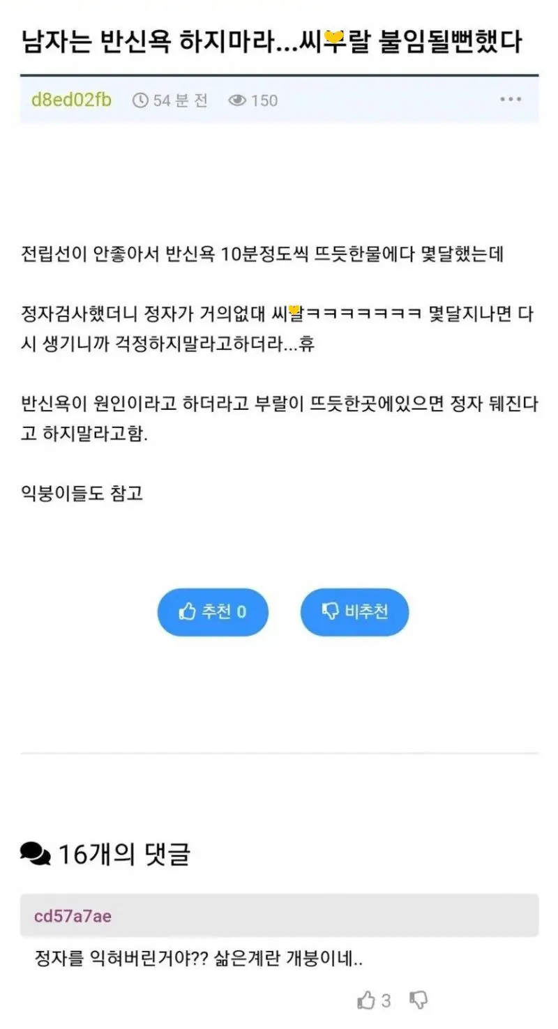 남자는 반신욕 하지마라.jpg 옛날 어르신들이 남자는 아래가 차가워야 한다고 했지...그래서 난 샤워를 하고 나서 언제나 냉수마찰을 한다. 겨울에 운전을 할때도 엉뜨는 안 튼다 공유하기 게시글 관리 벼락유머 저작자표시 (새창열림) 뜨고있는뿜
