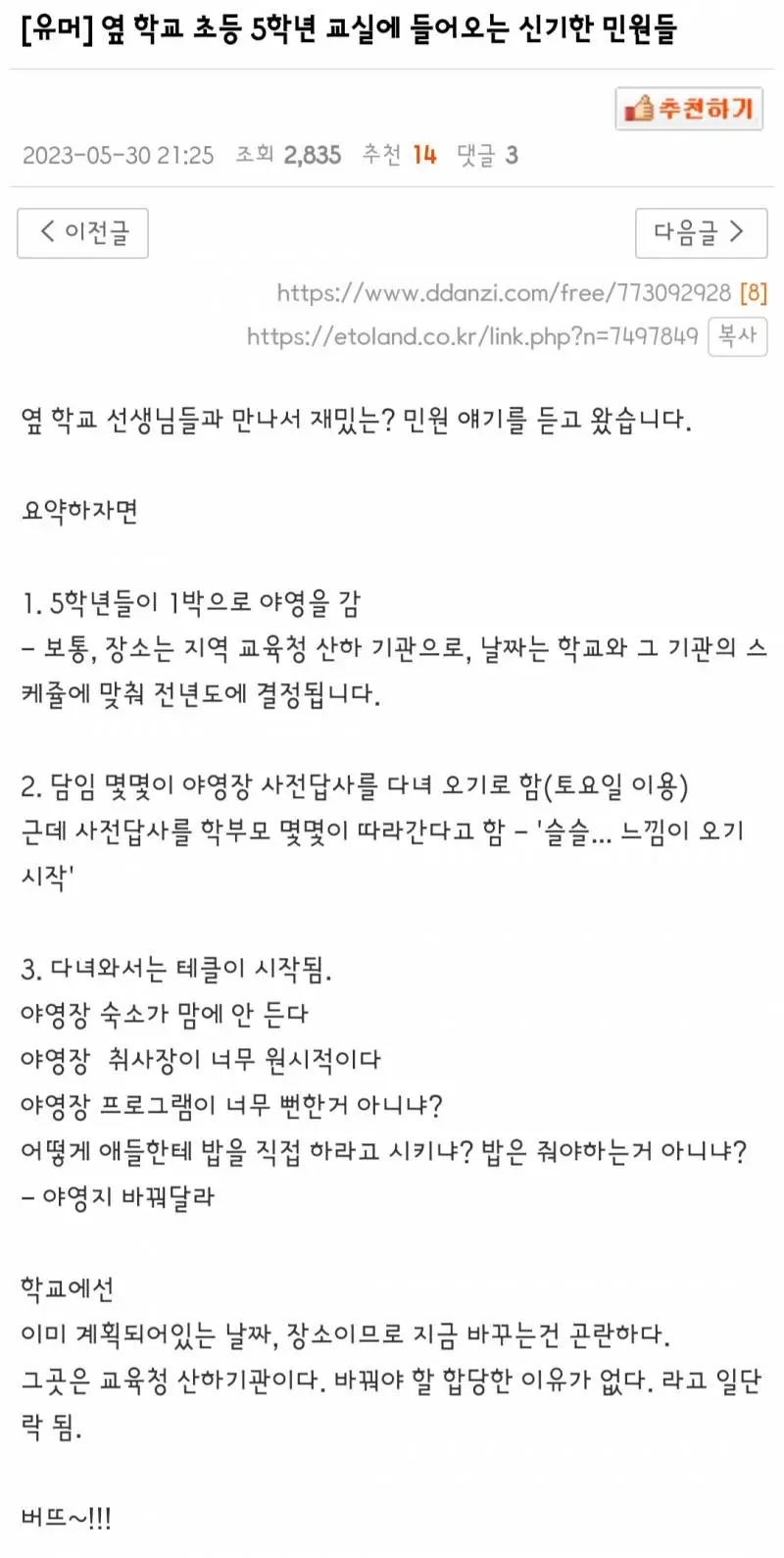 초등학교 5학년 교실의 신기한 민원들.jpg 예전에는 진짜 교사가 신의 직장이고 모두가 꿈꾸는 직장이었는데...이제는 그냥 회피 하고 싶은 직장이라고 하더구만...진짜 맘충이라는 단어는 이제는 병이다 공유하기 게시글 관리 벼락유머 뜨고있는뿜