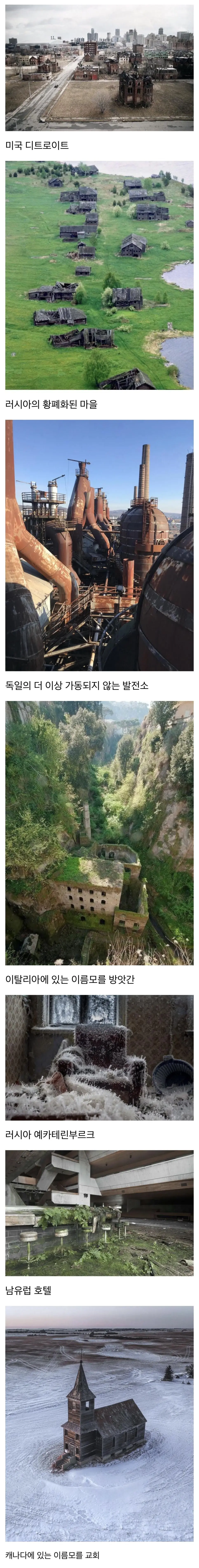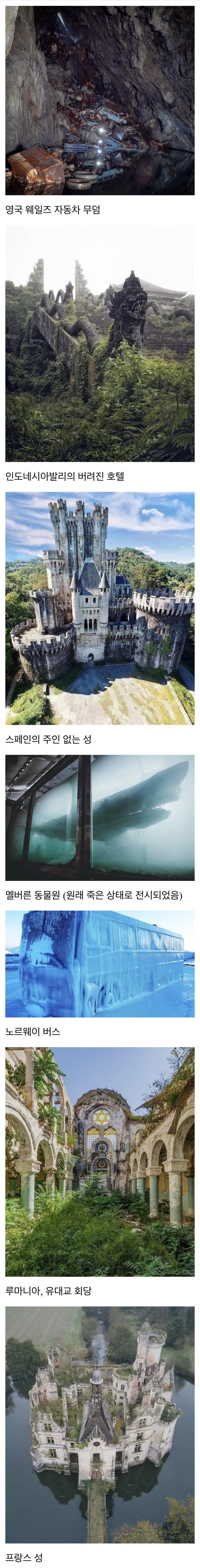 각 나라의 버려진 폐허들.jpg 산탄총 한자루 들고 가야할 장소들인거 같은데...한국 사람들에게 저런 곳이 알려지면 진짜 다들 사진 찍겠다고 난리나겠는걸 ㅋㅋㅋ 공유하기 게시글 관리 벼락유머 뜨고있는뿜