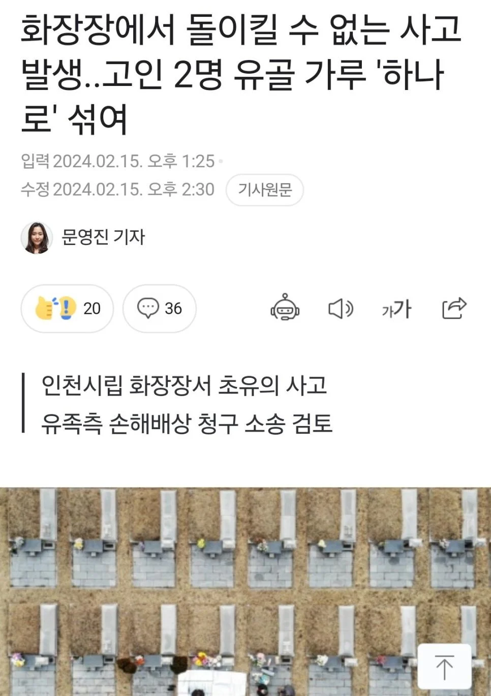 화장터 직원 실수로 유골 2개 섞여.jpg 15일 인천시설공단에 따르면 지난달 22일 인천시 부평구 인천가족공원 내 시립 화장장인 승화원에서 직원의 실수로 아무런 관계가 없는 2명의 유골 가루가 하나로 섞였다. 공유하기 게시글 관리 벼락유머 뜨고있는뿜