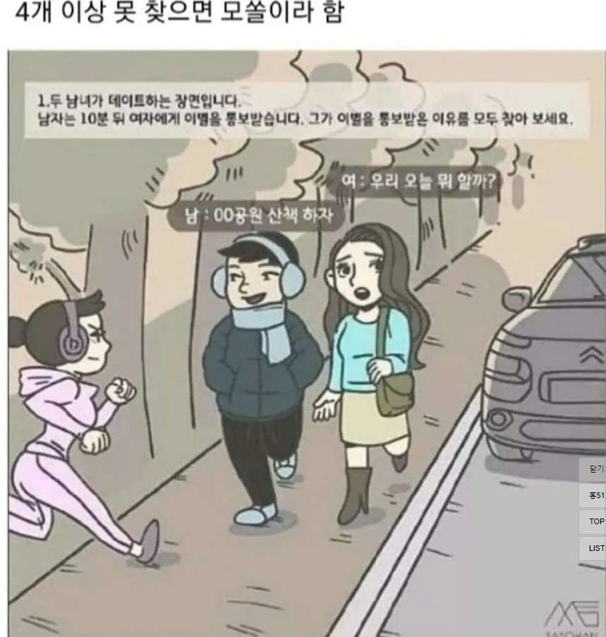4개이상 못찾으면 모쏠 여자를 차도 쪽으로 걷게 하고 있는거랑...조깅하고 있는 다른 여자에게 눈길을 주는것 그리고 나머지는 도대체 먼데...2개를 몰라서 나는 모쏠이었나 보다... 공유하기 게시글 관리 벼락유머 뜨고있는뿜