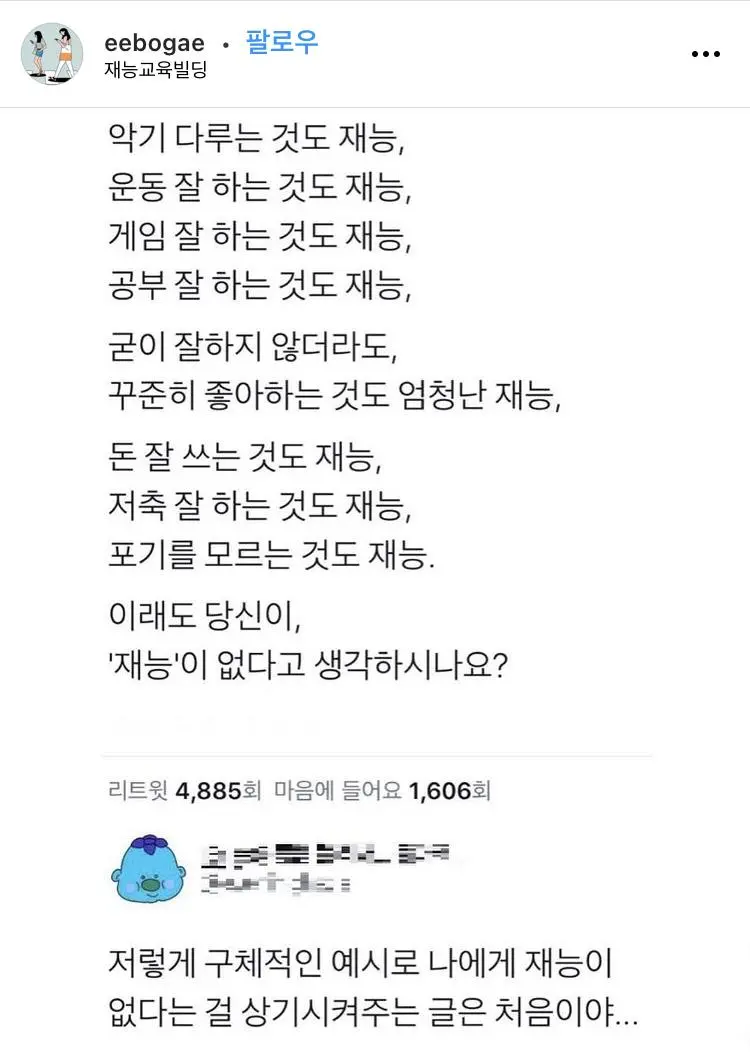 이래도 당신이 재능이 없나요? 숨쉬는 재능이 다하는 순간은 어쩔건데? 자기개발 글쓰는 사람은 ㅈ같음. 타인을 돕기보다 말장난만 하고 끝남. 실행하는건 님 사정입니다...라며 그냥 편히 살게 닥달하지마라. 공유하기 게시글 관리 벼락유머 뜨고있는뿜