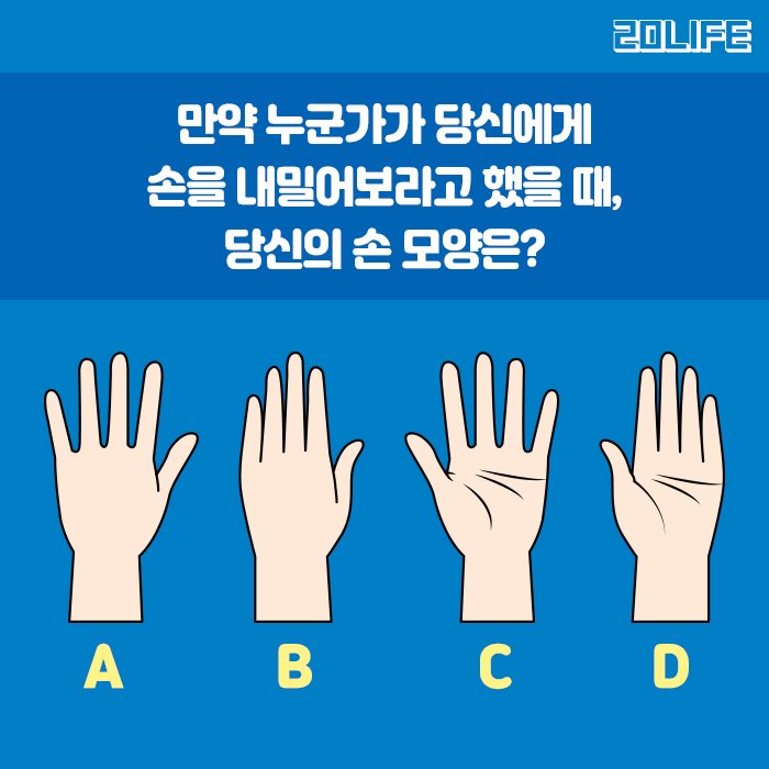 사람마다 행동은 모두 다르죠. 이러한 행동은 자신의 성격과 연관성이 있다는 연구 결과도 있었습니다. 특히 손을 내밀때 모습을 보면 그 사람의 성격을 알 수 있다고 하는데요. 그래서 오늘은 간단하게 손을 내미는 모습으로 알 수 있는 <나의 성격 심리테스트>를 해보도록 하겠습니다.