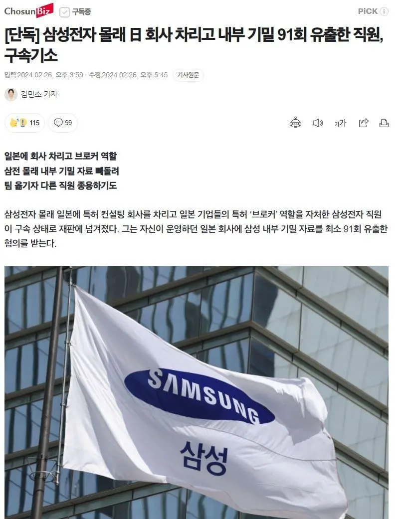 일본에 회사에 차리고 기밀 91회 유출한 삼성직원