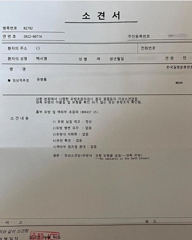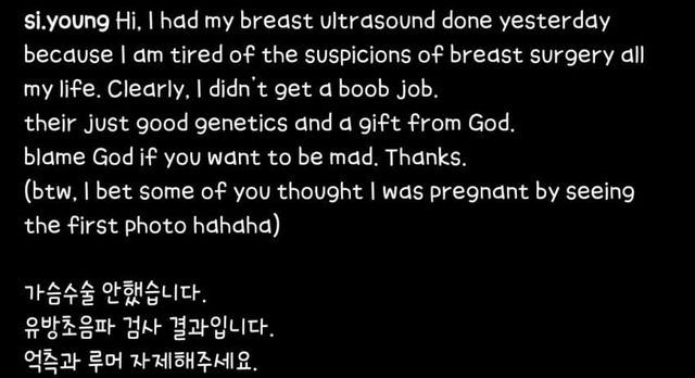 인스타 팔로우 50만명이 넘는 @si.young은 최근 자신의 인스타의 하나의 게시물을 공유했습니다. 많은 네티즌들 사이에서 확대 수술 의혹이 퍼지기 시작하면서 자신의 자연산을 증명하기 위해서 병원의 진단서와 함께 초음파 검사 결과를 공유한 것이었죠.
