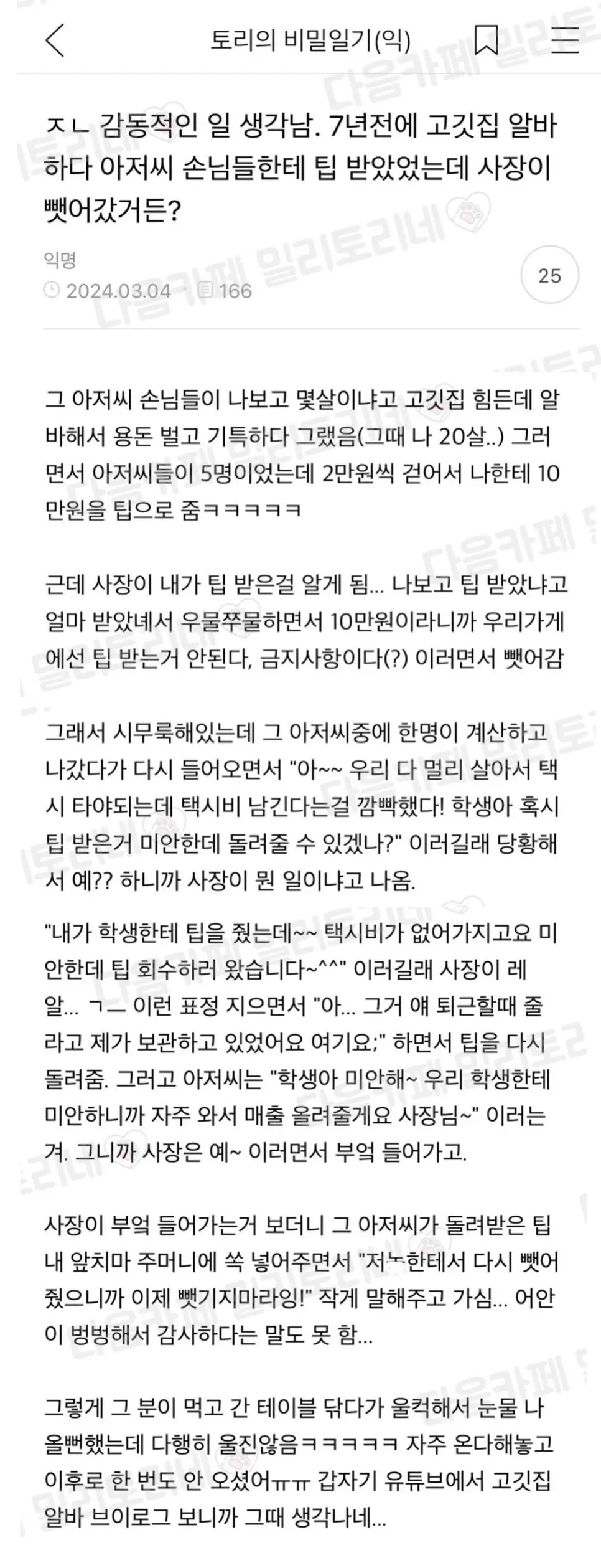 알바하다가 받은 팁 사장이 뺏어갔는데 그걸 본 손님
