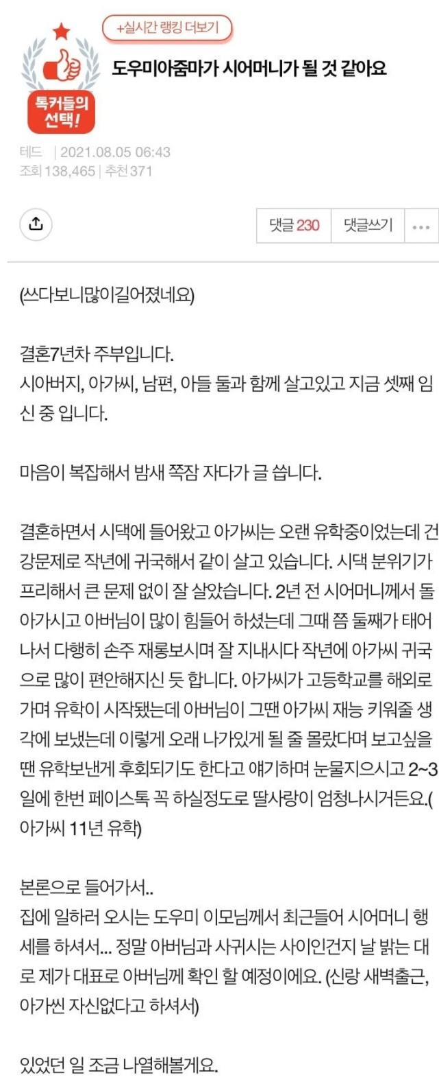 사연자는 결혼 7년차 주부로 시아버지, 아가씨, 남편, 아들 둘과 함께 살고 있으며 현재는 셋째를 임신중에 있다고 합니다. 그러다 최근 일이 생겨 마음이 복잡해서 밤새 쪽잠을 자가 사연을 남겼다고 합니다.