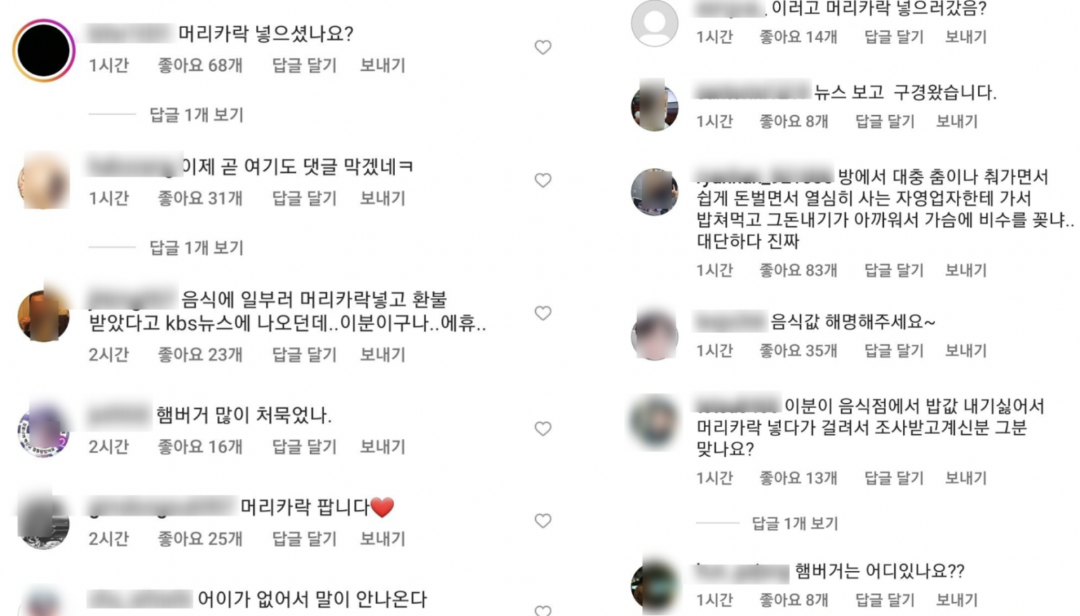 지난 14일 KBS 보도에 의하면 최근 햄버거 가게에서 여성 2명과 남성 1명이 먹던 음식에서 머리카락이 나왔다고 주장하며 환불을 받았다고 합니다. 이들은 한 달 전에도 같은 식당에서 음식을 다 먹은 뒤 음식에서 머리카락이 나왔다며 같은 음식을 다시 가져오라고 요구하면서 새롭게 나온 음식을 먹고 나간 적이 있다고 하죠. 음식점 주인은 이 점을 이상하게 생각해 CCTV를 확인하고서야 고의로 음식에 머리카락을 넣었다는 사실을 알게 되었다고 합니다.
