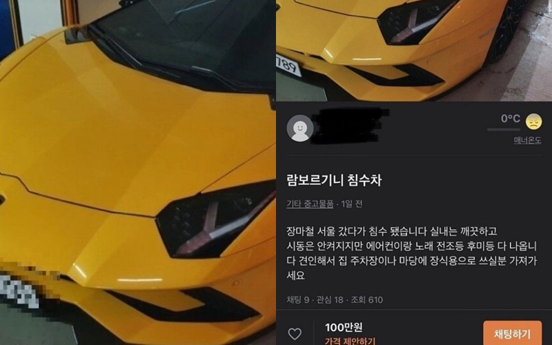 지난 16일 각종 온라인 커뮤니티 및 SNS등을 통해 경기도 이천시의 당근 마켓 이용자가 당근 마켓에 올라온 '람보르기니 침수차' 판매글을 캡처해 올리면서 빠르게 해당 내용이 퍼지고 있습니다. 판매자는 게시글을 통해 노란색 람보르기니 사진을 올리고 "장마철 서울에 갔다가 침수됐다. 실내는 깨끗하고 시동은 안 켜지지만 에어컨이랑 노래, 전조등, 후미등 다 나온다"라며 "견인해서 집 주차장이나 마당에 장식용으로 쓰실 분은 가져가라"라고 판매글을 올렸죠.